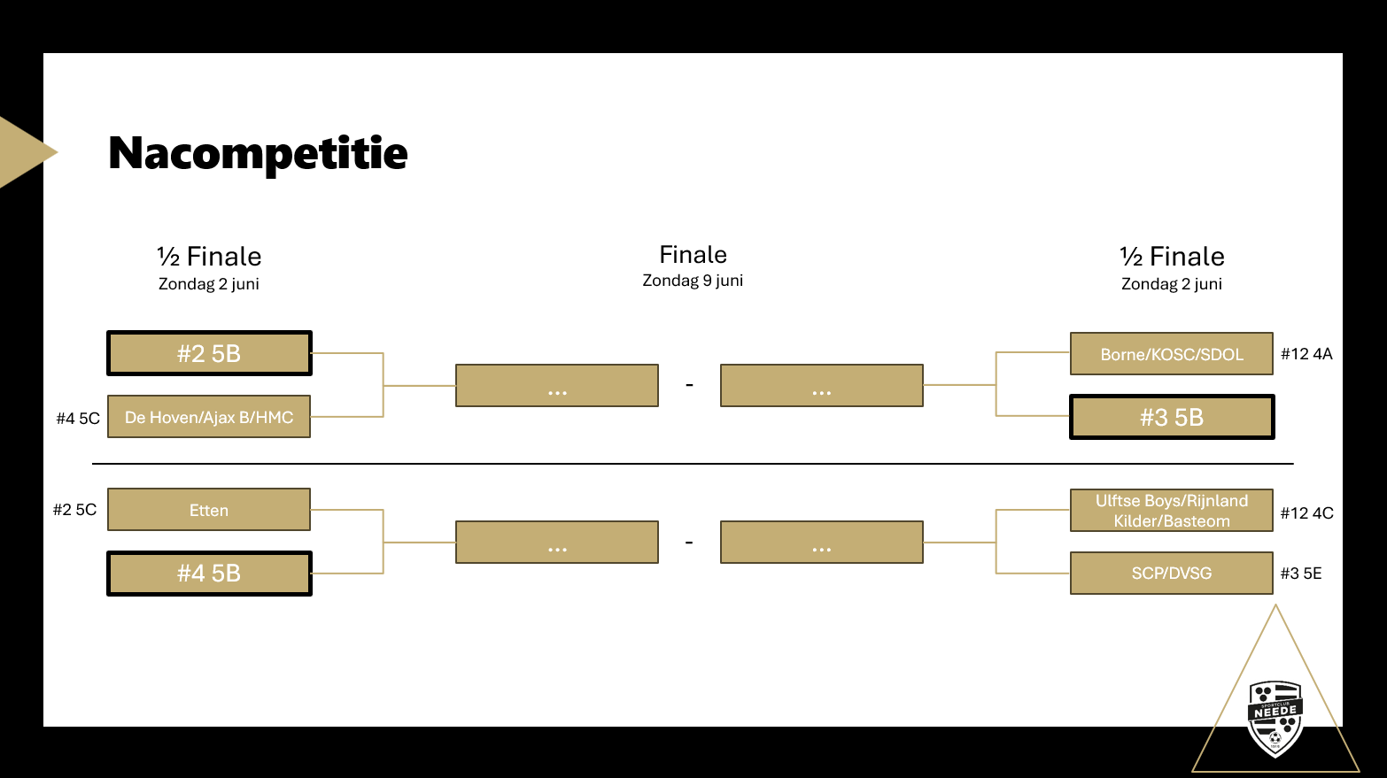 Een dag later verslikte Rekken zich in Rietmolen (1-1) en wist Erix nipt te winnen van MEC (1-2), waardoor het ongekend spannend is aan kop van 5B. Echter is Neede vermoedelijk na het gelijkspel van vorige week wel afgehaakt voor de titel. Met nog twee duels te spelen is dit de stand: