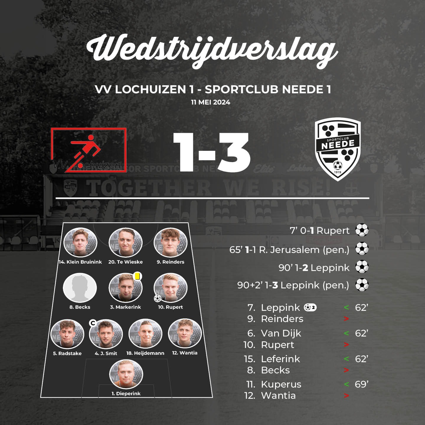 Prachtig weer, een prima veld en een flinke dosis publiek vulden afgelopen zaterdag de sfeer in Lochuizen. Alle ingrediënten aanwezig voor een mooie pot voetbal. Neede begon ook vrij aardig aan deze derby en kwam al na 7 minuten op voorsprong door Yordi Rupert. Echter verzuimde het team om deze voorsprong in het eerste half uur uit te bouwen naar een veilige marge van 0-2 of 0-3. In het laatste gedeelte van de eerste helft wist Lochuizen meer druk te zetten en creëerde het enkele gevaarlijke momenten. Keeper Kas Dieperink moest echter slechts één keer echt ingrijpen, toen hij een geweldig schot uit de tweede lijn met de vingertoppen tegen de lat tikte. Na rust was het rommelig en kreeg Lochuizen twintig minuten voor tijd een penalty om zo de 1-1 aan te tekenen. In de laatste fase drong Neede weer aan en wist het uiteindelijk via invaller Micthon Leppink (op aangeven van Joop Kuperus én via een penalty) toch de winst over de streep te trekken. Met deze overwinning is nacompetitie voor promotie veiliggesteld. De uiteindelijke positie op de ranglijst gaat bepalen tegen wie er op zondag 2 juni aangetreden mag worden voor een plekje in de finale van 9 juni.