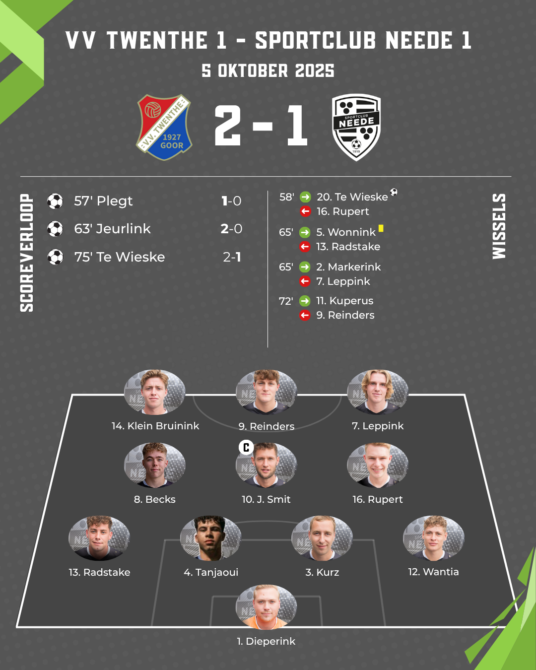 Na de pauze kwam Twenthe beter uit de kleedkamer en zette de gasten met veel druk op de opbouw vast. De thuisploeg stapte door in de pressing en dwong Neede tot fouten. In de 48e minuut betaalde dat zich uit: Luuk Freriksen vond Jelmer Plegt, die koel bleef en de bal door de benen van keeper Dieperink binnenschoof: 1-0.
