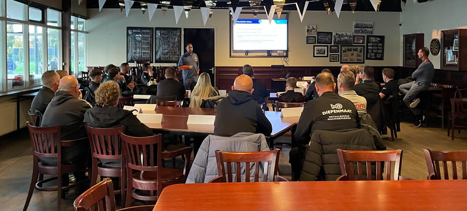 De doelgroep waren de trainers van de O8 t/m O13, die sinds de start van het seizoen met Rinus werken. Zo krijgen alle kinderen dezelfde structuur in de training. De avond startte om 18 uur, er waren ongeveer 25 trainers aanwezig! Buiten waren de trainers Joost Oriëns en Roy Harens met de medetrainers de oefenvormen voor het praktijkdeel aan het uitzetten. De O10-2 en O10-3 waren de oefengroepen.