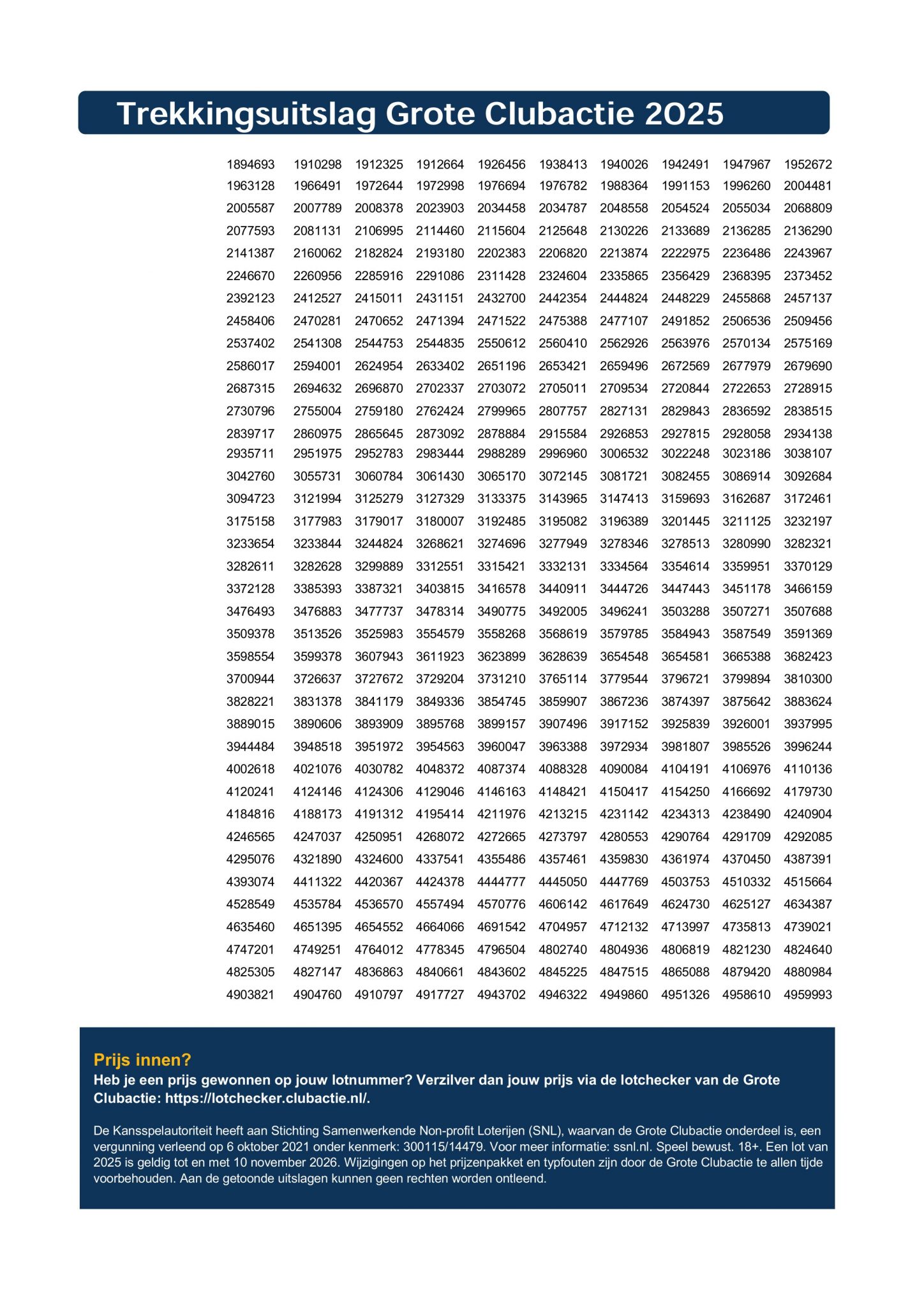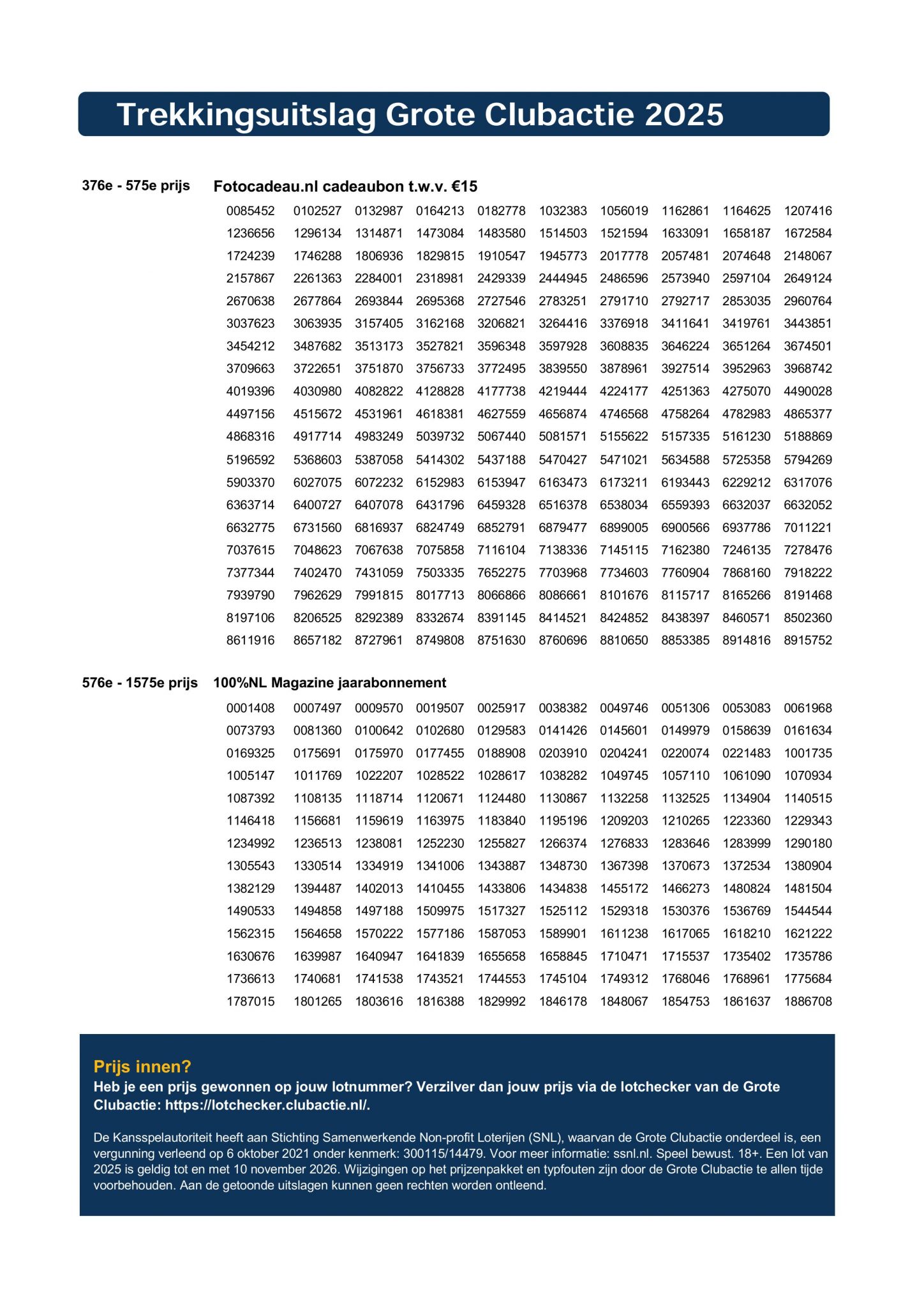 Hieronder de volledige trekkingslijst. Bent u in de prijzen gevallen? Gefeliciteerd?