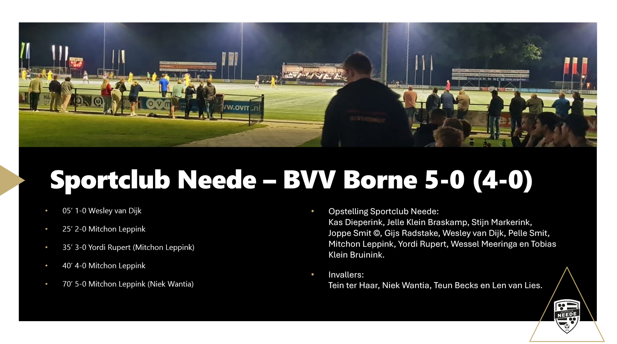 In de 70e minuut maakte Mitchon zijn vierde doelpunt van de avond en daarmee was het verzet volledig gebroken. Neede verzuimde in de laatste 15 minuten enkele mogelijkheden uit te spelen tot kansen en doelpunten. Hierbij viel op dat gelegenheidsrechtsbuiten Niek Wantia meerdere keren te snel was voor de linksback van Borne. Hoewel hij soms wat onzeker was in deze positie met balbezit, bracht dit veel dreiging met zich mee en had het uiteindelijk kunnen leiden tot nog drie extra doelpunten.